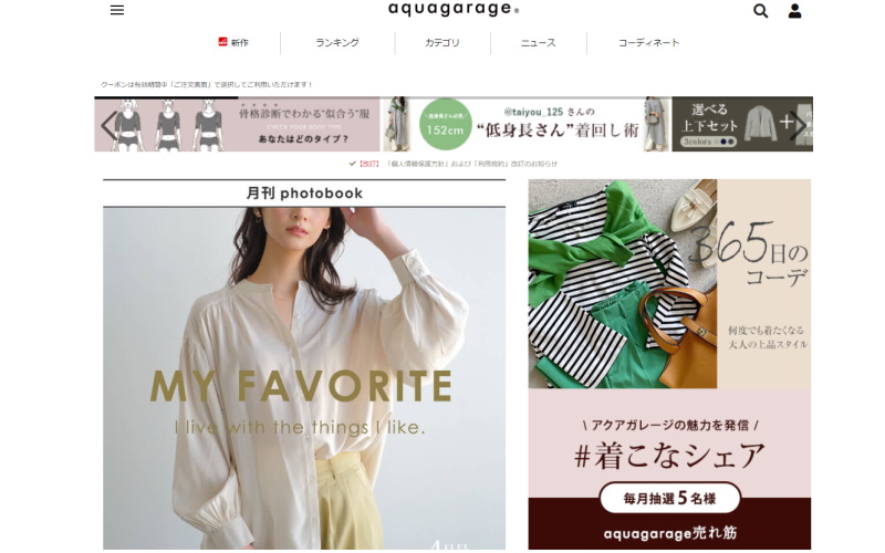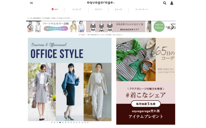 レディースファッションブランドのアクアガレージは、大人に似合う質のいいトレンド服をリーズナブルな価格で提供するブランドです。