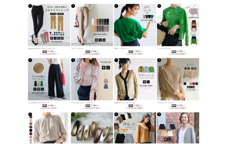 アクアガレージには、トレンド感があって通勤に使えるような服が多く、価格は非常にお手頃です。