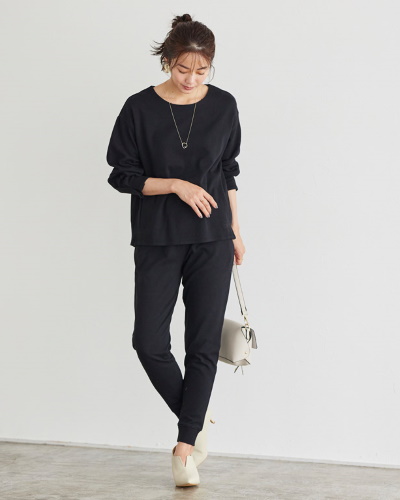 流行に左右されずに長く使える黒のカットソー。同じシリーズのパンツを合わせて、ベーシックなセットアップの着こなしを楽しめます。デザインはシンプルですが、ドロップショルダーやタックが効いていてオシャレです。