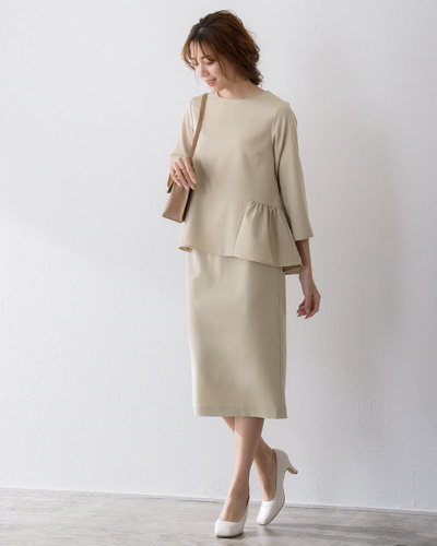 フリルが前身頃の脇からバックにかけて施されているため、気になるヒップをきれいに隠してくれます。浅めのボートネックと七分袖もバランスが良く、学校行事向けの上品なコーディネートが完成しますよ。スカートには透けを防ぐ裏地がついています。