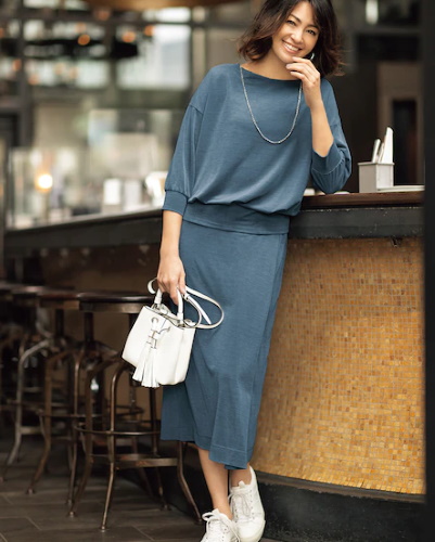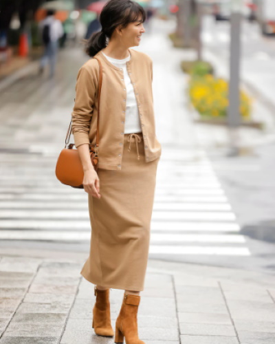 セットアップは上下の色がつながるので、ウエストの位置が目立たず体型カバーが叶います。さらに、トップスの裾をインして着ることで、視覚的にウエストの位置を高く見せることも可能です。トップスをボトムスに入れるときには仕上げに裾を軽く引き出し、ボリュームのバランスを整えると効果的です。