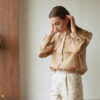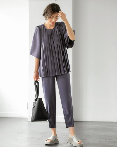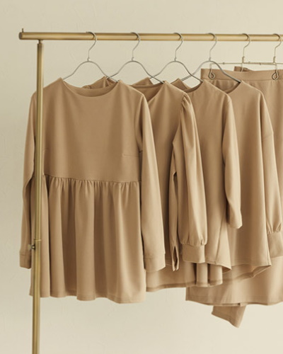 柔らかく着心地の良い素材で、着たときのシルエットもきれいに出るセットアップです。ブラウジングしたようなトップスと巻きスカート風のボトムスがポイントで、テクニックなしで誰でも着こなせます。カラーバリエーションは、くすみがかったブルー、明るいグレー、シックなキャメルの展開です。