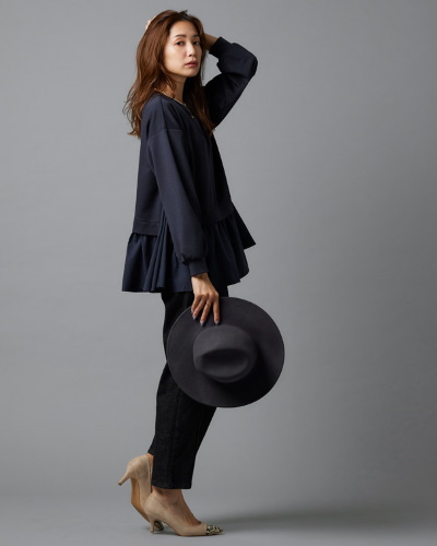 バランスの良い重ね着が実現することで評判のドッキングアイテム。ショート丈のプルオーバーとギャザーシャツを重ねたようなデザインがおしゃれです。端正な印象のネイビーで、大人っぽく着こなせます。
