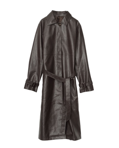 落ち着いたダークカラーが大人に似合うフェイクレザーのコート。たっぷりのロング丈で、膝下まで風をさえぎり暖かに。襟の大きさ、袖の幅、身幅など、シンプルかつ今年らしいデザインです。ベルトがついているので、コーデに合わせて見た目の印象を変えることができます。