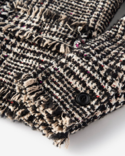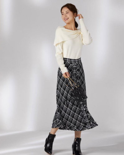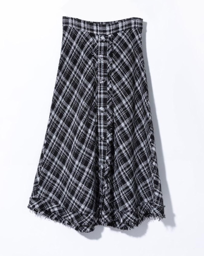 モノトーンのチェック柄でシックにまとえるツイードスカート。裾にはフリンジ風の加工がほどこされ、フォーマルに寄ってしまう心配もありません。きれいめからミックススタイルまで使えて、クラシカルスタイルの顔として活躍してくれそうです。フロントに並ぶくるみボタンが縦ラインを強調し、スタイルアップも期待できます。