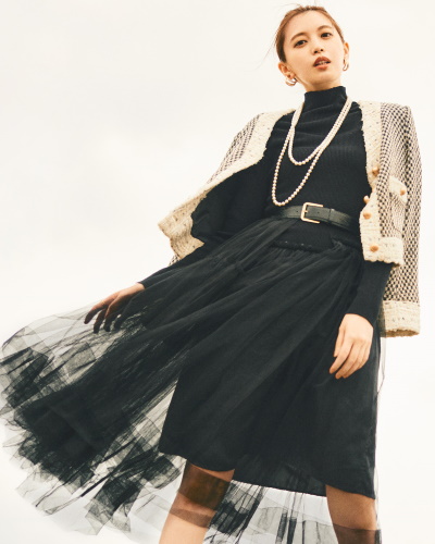 秋冬のイベントなどにおすすめしたいのが、ツイードジャケットを使ったミックスコーデです。ツイード生地がプラスされることで、モード感あふれるクラシカルスタイルに仕上がります。カラーだけをモノトーンで固定したら、トレンドのシアーな服やアクセサリーを使い、とことん自由にアレンジを楽しみましょう。