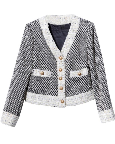 バイカラーのツイード生地を使用した上品なジャケットです。厚めの生地でシルエットがしっかりとしているので、秋冬のアウターとして幅広く活躍してくれます。丈は短めのクロップド丈になっているため、バランスが取りやすくなっていますよ。襟元はノーカラーのVネックで、すっきりと着こなせる作りです。