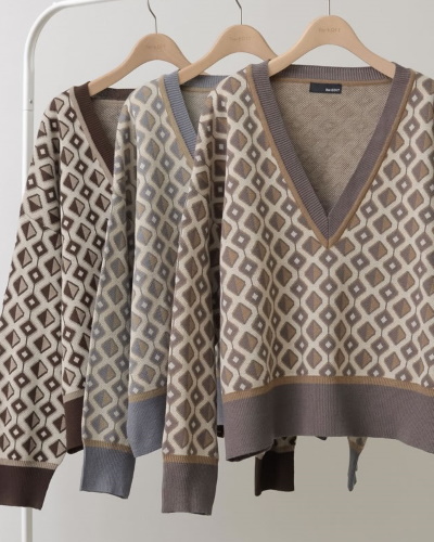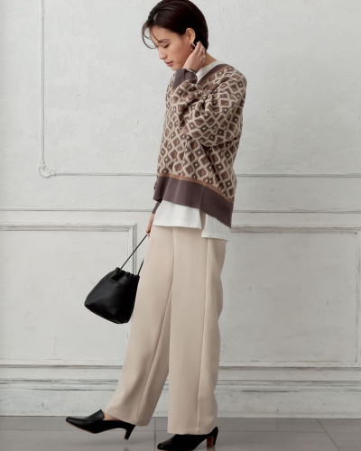 今季のコーディネートにあると便利なのが、レトロ感を演出できるジャガード織のニットです。きれいめのパンツスタイルに合わせるだけで、たちまち今風に。使い方によっては、ほっこり感が強く出てしまう柄なので、シンプルな小物を合わせて上品にまとめるとよいでしょう。ニット×幾何学模様のノスタルジックさを存分に楽しみたいですね。