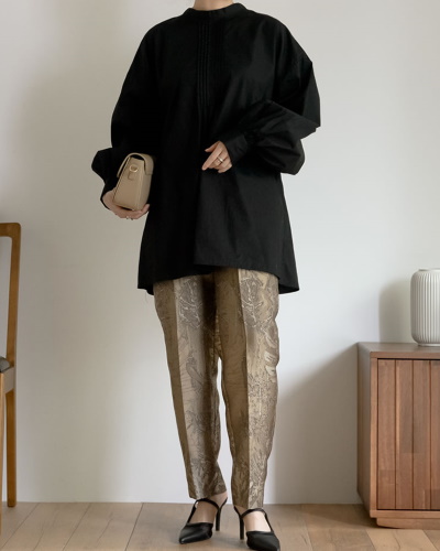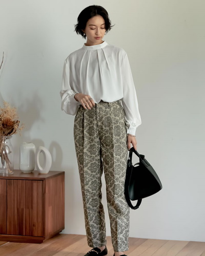 光沢のあるジャガード生地を使ったパンツは、ほかにはないリッチな雰囲気が魅力です。黒いブラウスを合わせれば、ホテルやレストランでの食事にも合うエレガントな装いが完成します。ブラウスはボリュームのあるデザインを選ぶと華やかに見えますよ。
