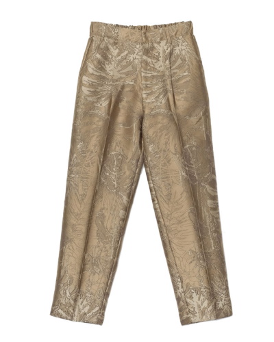 光沢のあるジャガード生地を採用し、品のある装いを叶えてくれるパンツです。ウエストの後ろはゴム仕様なので、上品ながら気楽に着られるのが嬉しいですね。シルエット調のリーフ柄がモードな印象です。