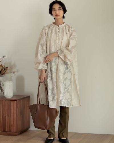 ジャガード生地を主役にした、チュニックブラウスとパンツのコーディネート。自然な凹凸のあるジャガード生地で、春夏のシアーコーデとは違う表情を見せてくれます。ナチュラルなファッションがお好きな方にもぴったりのコーディネートです。