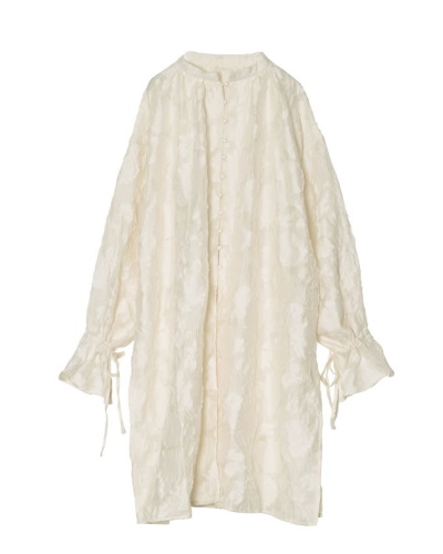 レースのようなジャガード織の生地を使ったシアーブラウスです。デザインはフロントボタンなので、前を開いて羽織りものとしても使えますよ。インナーに濃い色の服を着ると、柄がふわっと浮き出て華やかな印象に。早めに取り入れて着こなしを満喫してみたくなる一枚です。