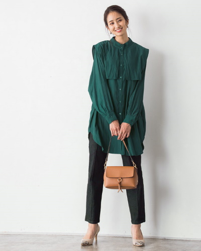 スクエアカラーのブラウスとデニムパンツを合わせて、親しみやすいクラシカルスタイルに。ブラウスの色が深いグリーンなので、デニムパンツも黒などのダークカラーが合いますね。トレンドトップス×デニムの着こなしは、今季のさまざまなスタイルに応用できそうです。