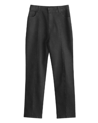 深みのあるカラーで秋冬のコーディネートに合わせやすいデニムパンツです。フロントにはピンタックが入っていて、すっきりとした美脚が望めます。シルエットは合わせやすいストレートで、飽きずに長く使えます。