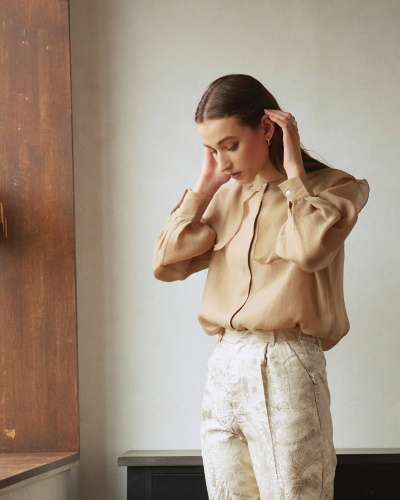 大本命のサテン生地を効果的に使うなら、今季のファッションで出番の多いクラシカルなブラウスがおすすめ。定番のホワイトやブラックのほか、季節感のあるベージュやブラウンを選んでも素敵です。シンプルな無地のブラウスなら、ジャガード織やツイードなど、季節の生地でできたボトムスにも合わせやすいでしょう。