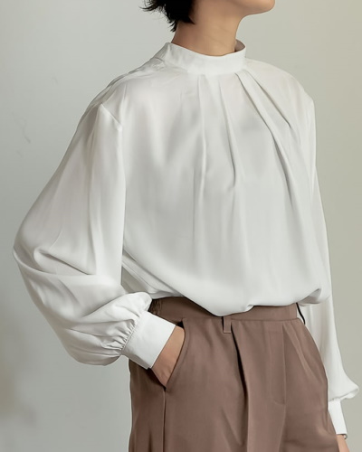 光沢のあるサテンでできたブラウスは、顔まわりに華やかさをプラスできるアイテムです。表情を明るく見せる効果も期待できるので、人と会うシーンやオンライン会議の服装にもぴったり。こちらのアイテムは襟元に高さのあるバンドカラーがポイントになっていて、ベストやカーディガンを羽織ってもバランスよく着こなせます。