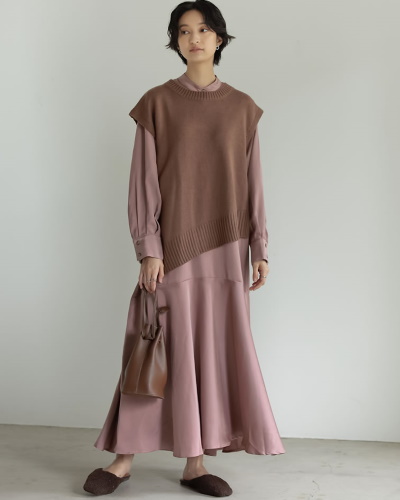 ドレープやフレアで光沢がきれいに出るサテンは、生地を多く使ったワンピースにも向いています。ベストを重ねれば、トレンド感あふれるレイヤードスタイルを楽しめますよ。肩と裾にボリュームをつけると、バランスのいいXラインのシルエットに。目の細かいサテンとベストの組み合わせは、暖かさの視点でも合格ですね。