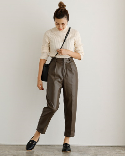 シンプルな形のテーパードパンツでも、生地がレザーになるだけでトレンドコーデに早変わりします。トップスにはニットのアイテムを合わせて、秋冬らしいコーディネートを楽しんでみてください。レザー生地は風を通さないので、おしゃれを兼ねた防寒対策にも持ってこいですね。