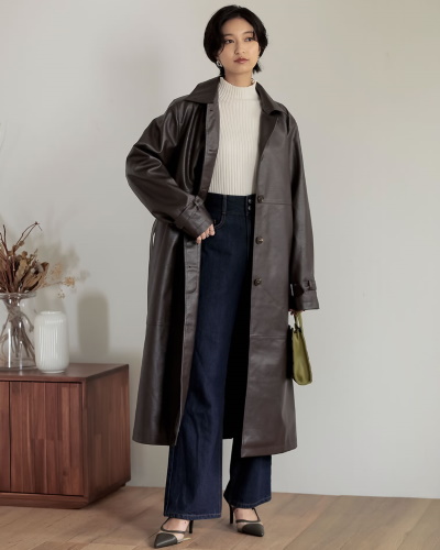 シンプルなレザーのロングコートで魅せる上品なコーディネートです。体のラインがすっきり見えるので、秋冬ファッションの着ぶくれが気になる方にもおすすめですよ。雰囲気たっぷりのレザーコートで、シンプルなデニムスタイルも今風に決まります。足元にパンプスを合わせると、ハードさが中和されてフェミニンです。