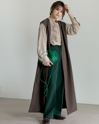 すっきりとしたIラインが叶うと大人に支持されているのが、ロングジレとパンツの組み合わせです。トレンドカラーのパンツなら鮮度抜群に。今季はこのコーデにクラシカルなブラウスを足して、旬の装いをいち早く楽しんでみましょう。ブラウスはフロントにデザインのある新鮮な一枚がおすすめです。装飾を引き立てるために、ジレは襟元がすっきりとしたVネックを選ぶとよいでしょう。