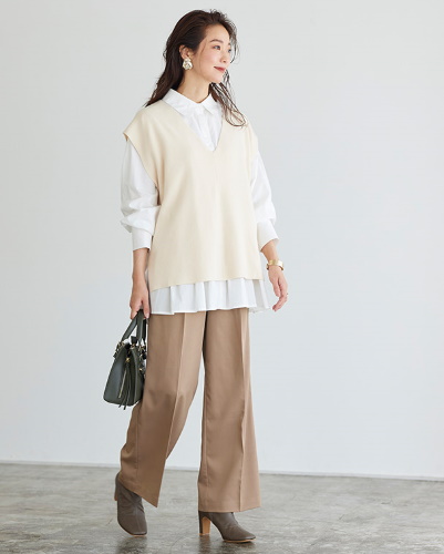 ニットベストでクラシカルに仕上げたパンツスタイル。清潔感のある白いブラウスを合わせれば、きちんと見せたいオフィススタイルにも対応します。ベストは寒さ対策の羽織りものとしても使えるので、秋のコーデに暖かさをプラスしたい場合も便利です。装飾を控えたデザインなら着まわしもしやすいですよ。