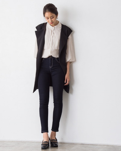 ジレとブラウスの組み合わせは、今季のクラシカルファッションによく見られる鉄板のスタイルです。ボトムスの素材がデニムなので、自然なカジュアルさが感じられますね。着やせを意識する場合は、ジレとパンツを濃い色にすると、縦のラインが強調されて引き締まって見えます。仕上げにビットのついたローファーをプラスすれば、気品のあるクラシカルファッションの完成です。