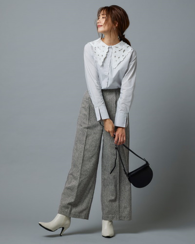 ツイードパンツ×ビッグカラーブラウス
