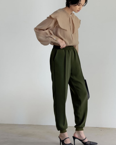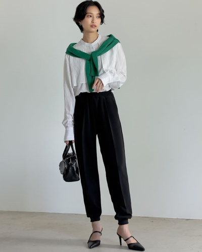 ブラウスのクラシカルなスタイルをモダンに見せているのは、ボトムスに選んだジョガーパンツです。スポーティーな要素が加わることによって、一気に今っぽさが漂います。流行りのコーディネートに差をつけるなら、トレンドカラーのグリーンをカーディガンで取り入れてみるのもおすすめです。