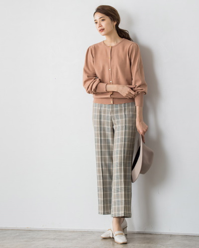チェック柄はクラシカルなコーディネートと相性が良く、選ぶカラー次第で主役にも脇役にもなれる柄です。ベージュを基調とした控えめなチェックのパンツなら、フェミニンなピンクベージュのトップスを引き立てて、クラシカルスタイルが上品に決まります。ゴールドのボタンやビットが使われたアイテムを選べば、アクセサリーがなくても華やかです。