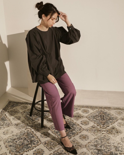 カラーパンツ×ボリューム袖ブラウス