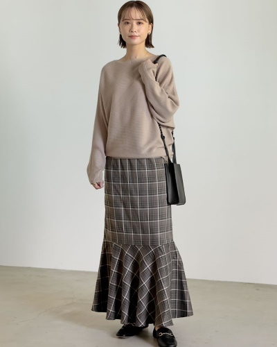 トレンドのチェック柄をスカートでとりいれたクラシカルスタイル。スカートはロング丈のマーメイドシルエットで、エレガントで雰囲気のある仕上がりとなります。ボトムスがトレンド感いっぱいなので、トップスはこちらのリブニットのように、シンプルなものを選ぶとバランスが良いです。