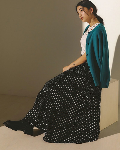 ドット柄スカート×カラーカーディガン