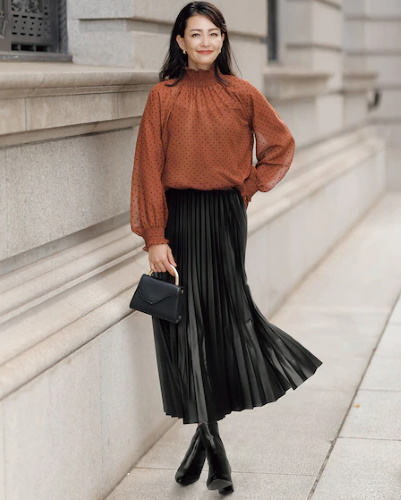 クラシカルスタイルの定番ともいえるのが、プリーツスカートとブラウスの組み合わせです。それぞれ素材はレザーとシアーを選ぶと、鮮度の高いおしゃれなコーディネートに。アースカラーとブラックの配色によって、落ち着きのある大人の装いを演出できます。
