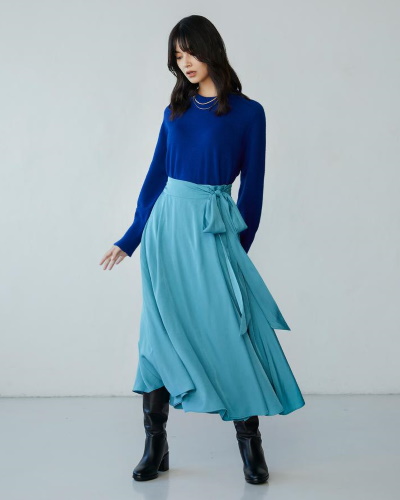 落ち感のある柔らかい生地により、きれいなドレープを描くロングスカート。リボンのついたラップ風のデザインで、クラシカルな雰囲気を演出できます。全身にカラーを使うのは難しそうに感じるかもしれませんが、リラックス感のあるブルーを選ぶことによって着こなしやすくなります。トレンドカラーを存分に楽しみながら、洗練されたクラシカルスタイルを目指せますよ。