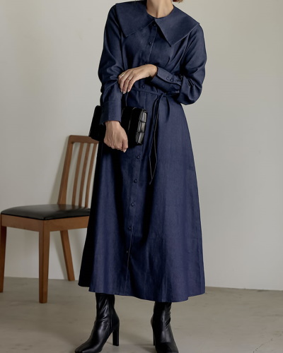 気取りのないデニム素材のワンピースで作る、今年らしいクラシカルスタイルです。取り外せるビッグカラーがついているので、襟を外したシンプルな着こなしも楽しめますよ。黒いレザーのバッグとブーツを合わせたことで、幼く見えない大人のコーディネートを叶えています。