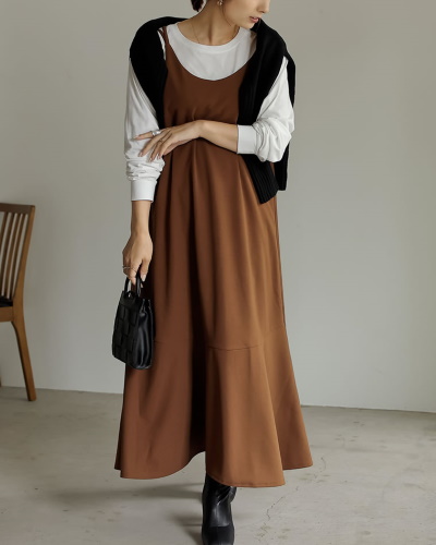 抜け感のあるキャミソールワンピースの人気が続いていますが、今シーズンに新しく買うなら、クラシカルコーデが楽しめるマーメイドシルエットがおすすめです。ワンピースの下にはシンプルなコットンのトップスを着て、肩の力を抜いたレイヤードスタイルに。シックなブラウン系のカラーが秋らしさを印象づけています。