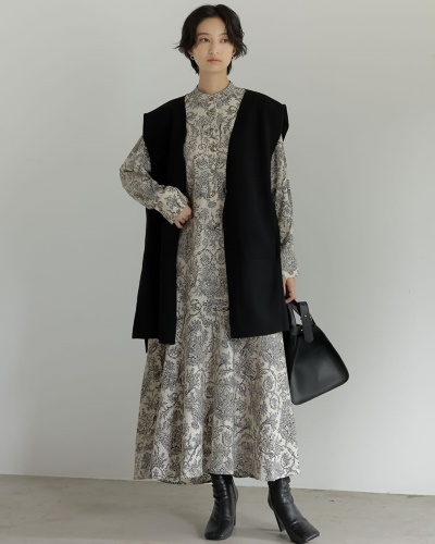 クラシカル柄ワンピース×ベスト