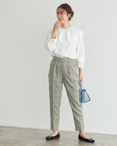 ビッグカラーブラウス×チェック柄パンツ