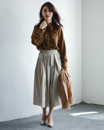 ボウタイブラウスにスカートを合わせれば、気品あふれる王道のクラシカルスタイルが完成します。ブラウンとベージュの配色が肌になじんで、大人の着こなしとして魅力を放っていますね。シューズなどの小物を明るい色にしたことで、抜け感のある今風のコーディネートに。ボウタイで首元が暖かいのも嬉しいですね。