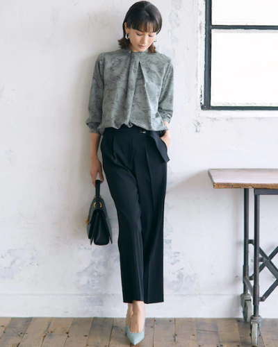 きちんと感と華やかさを兼ね備えた花柄のスタンドネックブラウスは、オフィスでのコーディネートにも好印象です。ペールブルーとネイビーの組み合わせなので、トレンドスタイルの新鮮さはありつつも、仕事着としての落ち着きが感じられます。ボウタイ風の襟元やラップデザインのパンツなど、デザイン性のある服を選ぶとモードな印象に。