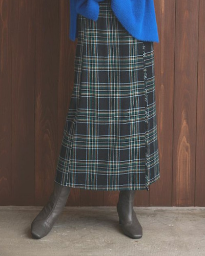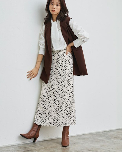 ブラウスやリブニットに重ねて使うと、季節感のあるクラシックコーデが即座に完成します。