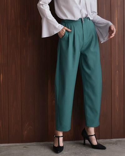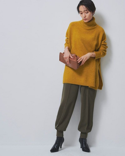 きれいめのパンツとローファーでオフィスカジュアルに、トレンドカラーのニットで印象的に着こなすのもおすすめ。