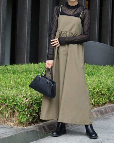 細いストラップでフェミニンに着こなせるキャミワンピースは、秋冬のレイヤードを軽快に楽しみたい人におすすめのアイテム。