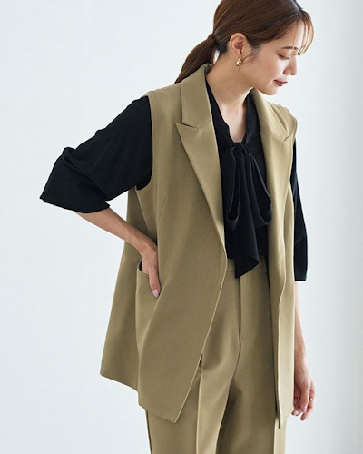 マスキュリンファッションが注目されている今季は、きちんと感のあるテーラード調のジレが目立ち、同素材のボトムスとセットアップで使えるアイテムも増えています。