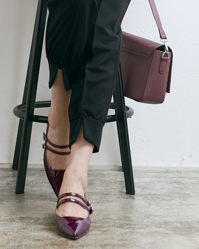 メリージェーンのデザインで大人向けのブランドに多いのは、ポインテッドの尖ったつま先と細いストラップを添えたもので、カラーはブラックをはじめとするダークカラーの他、トレンド感のあるレッド系やシルバーも登場しています。