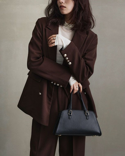 マスキュリンやエレガントなどクラシカルなファッションと相性がいいのは、レザーに金具を添えたレトロな台形バッグです。