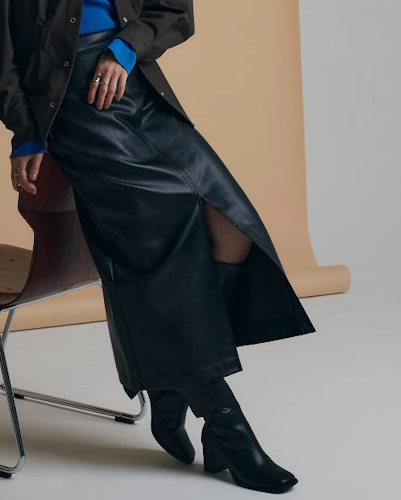 ロング丈のボトムスやアウターでたっぷりと生地を取り入れるのが主流で、アイテムの多くにはサステナブルなフェイクレザーが使用されている様子。
