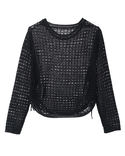 かぎ編みが特徴的なこちらのニットは、サイドギャザーがふんわりとしたシルエットを生み、フェミニンなアイテムにも合わせやすくなっています。