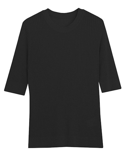 すっきりコンパクトに着られるこちらのニットは、秋のスイッチシーズンに活躍する5分袖のデザイン。
