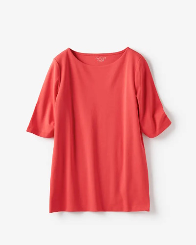 この時期にあると重宝するのが5分袖のトップス。半袖以上、長袖未満で使えて、二の腕もカバーできる大人に嬉しい袖丈です。